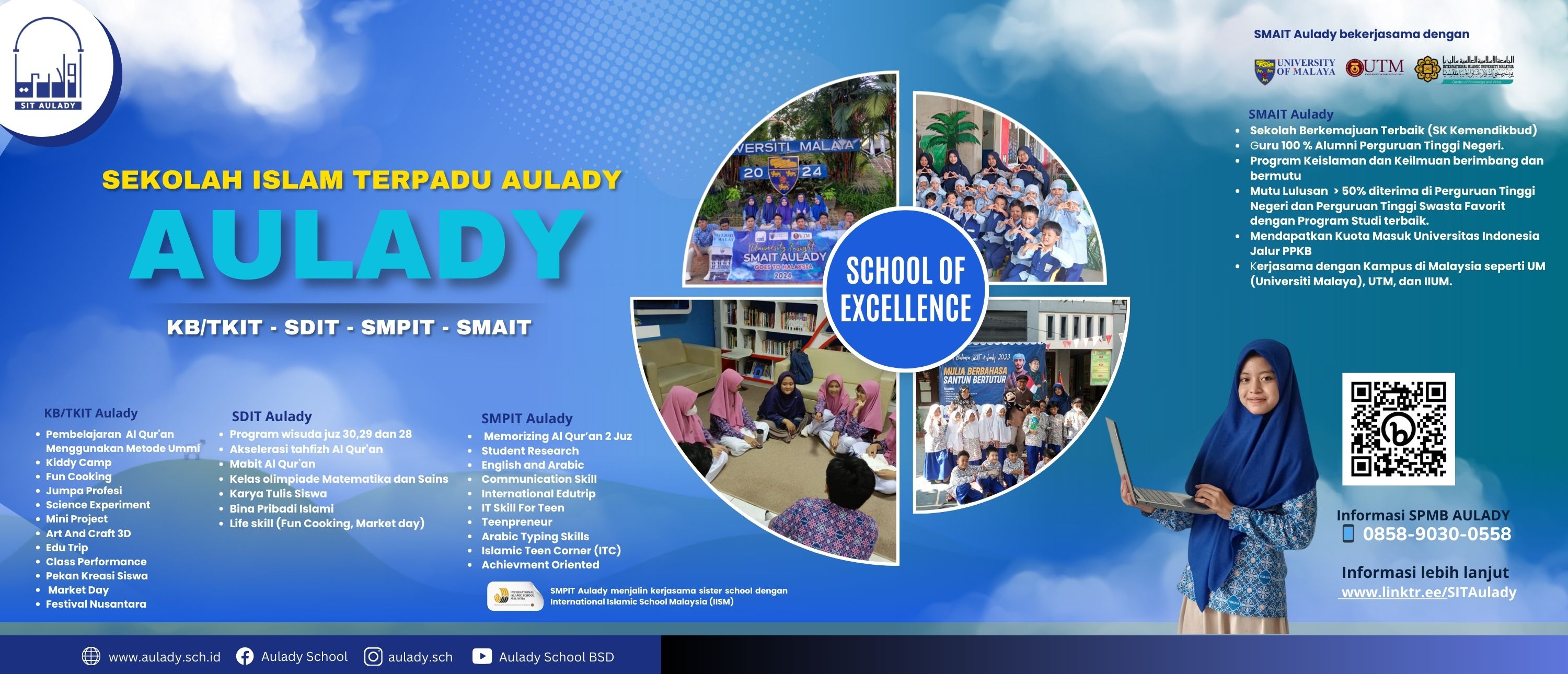 "AULADY SCHOOL OF EXCELLENCE" Perpaduan antara pendidikan Islam dan kurikulum modern, fokus pada penanaman karakter islami dan leadership, serta pengembangan life skill melalui berbagai kegiatan. SIT Aulady juga menekankan teknologi, literasi informasi, dan pembelajaran bilingual dengan program unggulan seperti penghafalan Al-Qur'an (tahfidz).
